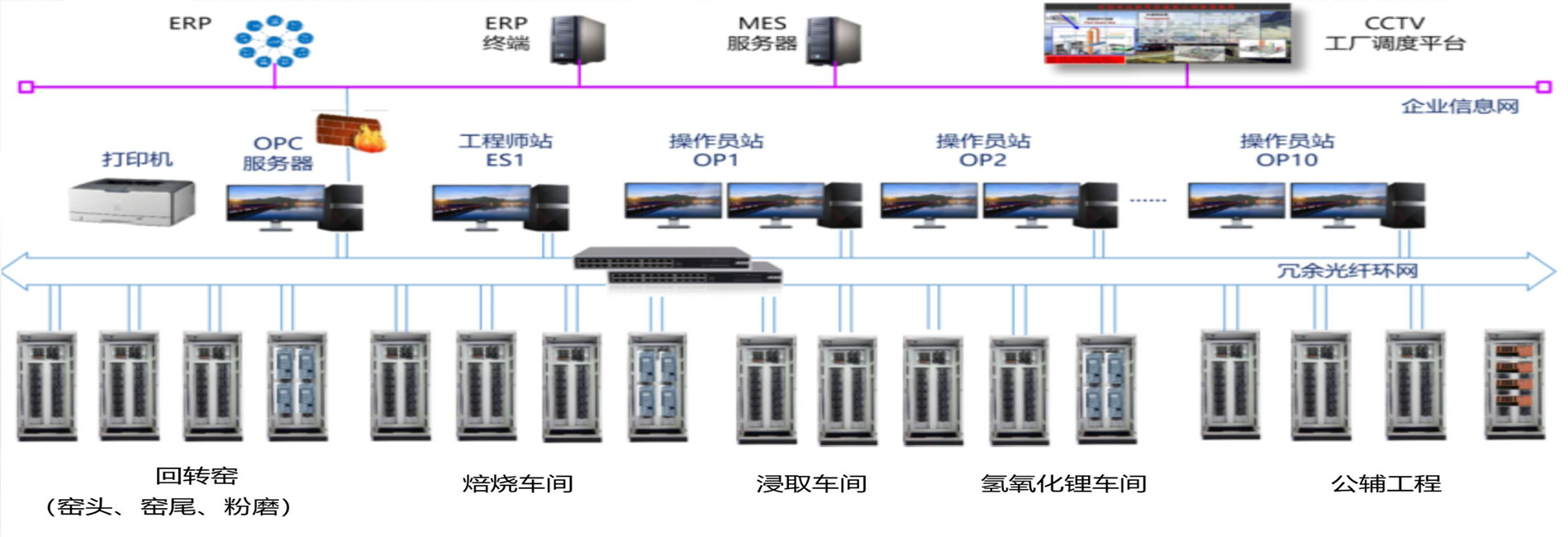 電池級氫氧化鋰項目的生產(chǎn)工藝采用成熟的“硫酸法礦石提鋰”工藝,生產(chǎn)過程主要在轉(zhuǎn)化焙燒裝置、酸化焙燒裝置、浸出裝置、氫氧化鋰裝置內(nèi)完成。DCS的控制涉及4個車間的裝置,其中涵蓋了從焙浸工段(轉(zhuǎn)化焙燒、酸化焙燒、調(diào)漿浸出與洗滌、浸出液凈化、凈化液蒸餾濃縮)、氫氧化鋰工段,成品工段(一次沉鋰、二次沉鋰、成品)等電池級氫氧化鋰生產(chǎn)全過程